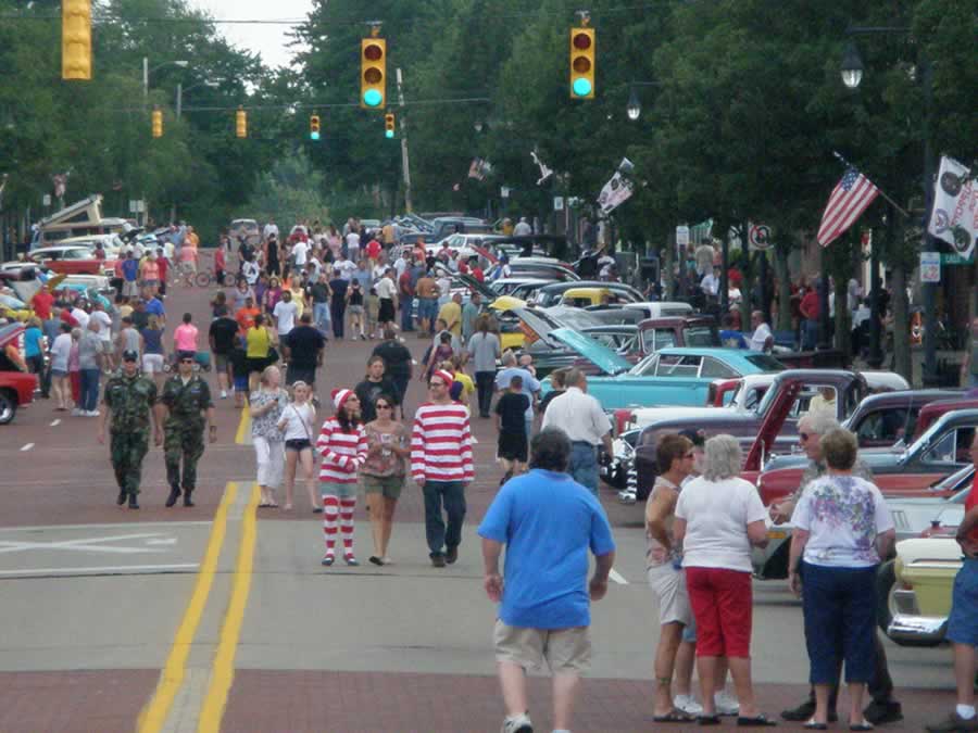 Cruise in – usually July 2 – in downtown Albion transforms Albion’s downtown to a pedestrian only mall type space, where people get the exercise, and cars get parked.