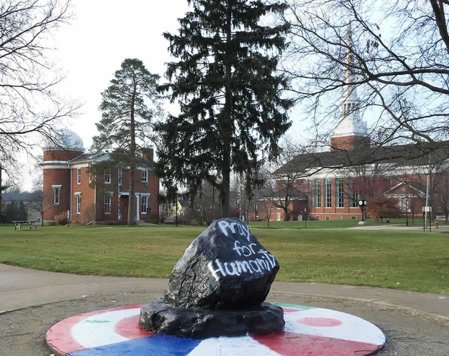 Albion College “quad” has several distinctive landmarks including the often painted “Rock.”