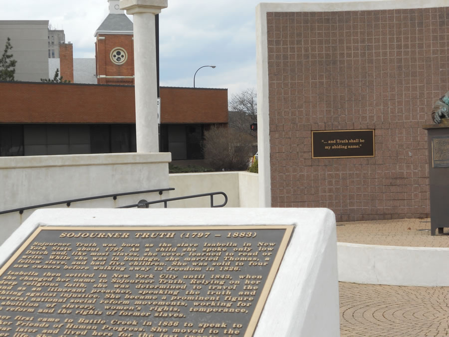 Sojourner Truth memorial park in Battle Creek. Sojourner was an African-American abolitionist and women’s rights activist. Truth was born into slavery in Swartekill, Ulster County, New York, but escaped with her infant daughter to freedom in 1826. After going to court to recover her son, in 1828 she became the first black woman to win such a case against a white man.