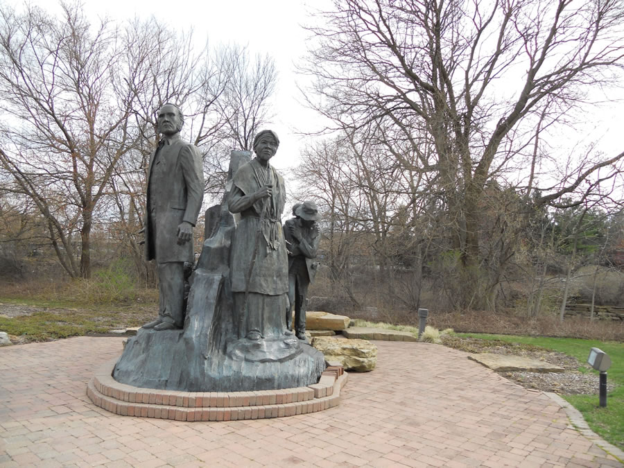 The nation’s largest monument to the Underground Railroad. The 28-foot long, 14-foot high bronze statue depicts abolitionist Harriet Tubman, known as “Black Moses,” and local “conductors” Erastus and Sarah Hussey as they lead a group of runaway slaves to safety. Designed by sculptor Ed Dwight. Near the Kellogg House in downtown Battle Creek. Built by the W.K. Kellogg Foundation to honor men and women who operated the Underground Railroad, as well as courageous fugitives who fled north to freedom.